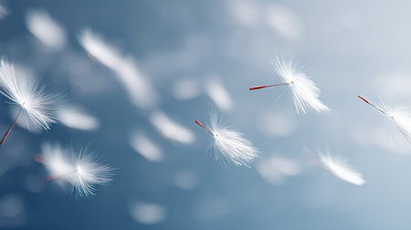 Image of dandelion seeds gently drifting in the air against a soft blue background. The seeds are depicted in a graceful and delicate way, with a focus on the movement and texture of the fluffy seeds. The soft blue background provides a serene and tranquil ambiance to the image.