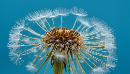 dandelion seeds with drops of water on a blue background close-up