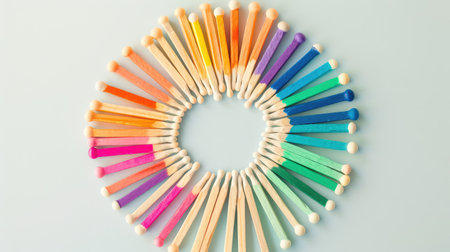 A vibrant collection of colorful wooden sticks arranged in a smooth gradient from orange to purple. Perfect for artistic projects, crafts, and educational activities.