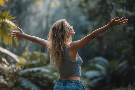 Free woman enjoying the calmness of a lush forest while inhaling the fresh air and embracing nature during a sunny day