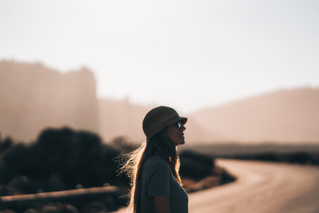 A woman wearing a hat by a winding road in a scenic landscape during a afternoon