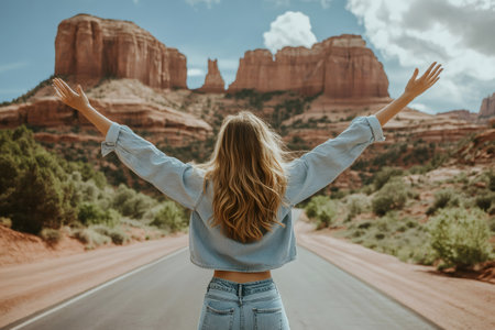 Young woman with open arms enjoys her solo trip in Sedona, Arizona, celebrating freedom and adventure on a scenic road trip
