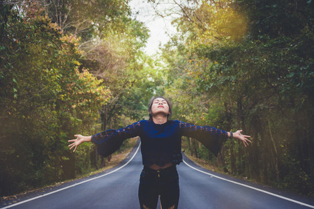 Asian women travel relax in the holiday. Stand up to receive rain. Wild nature wood on the mountain.