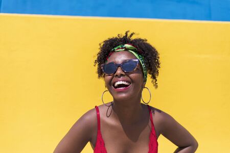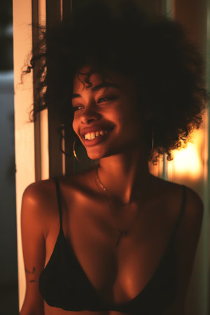 Portrait of beautiful African American woman laughing and smiling in sun rays outdoor. Emotions concept. Generative AI