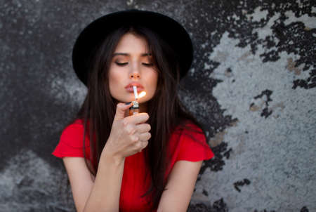 Close up portrait of a beautiful young woman use cigarette lighter for lighting cigarette outside. Attractive beautiful lady smokes the cigarette because she gets stressed.