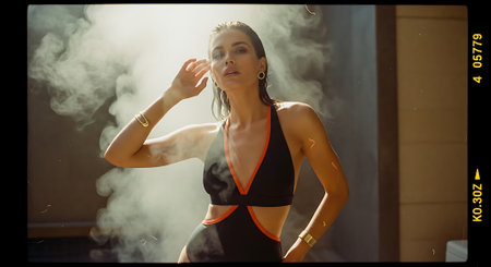 A serene woman relaxing in a steamy outdoor setting after a workout