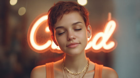 A young woman with short hair and a cheerful expression is posing in a soft-lit urban setting. Her closed eyes and serene demeanor convey a sense of tranquility and peace.
