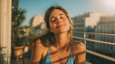 A young woman sits on a balcony basking in the warm afternoon sun. She smiles contently while the sun casts gentle shadows, creating a serene atmosphere.