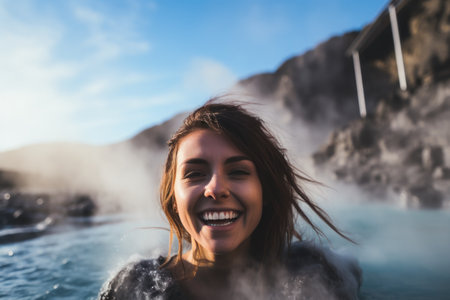 Amidst the therapeutic steam, a satisfied woman grins in delight during her thermal bath, a visual representation of the tranquility found in the warm embrace of the waters