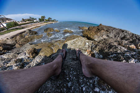 View of the sea with fisheye and legs in the foreground