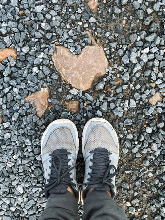 A person is currently standing beside a heartshaped rock that is positioned on the ground, showcasing a unique natural formation that captures attention and curiosity in the surrounding area