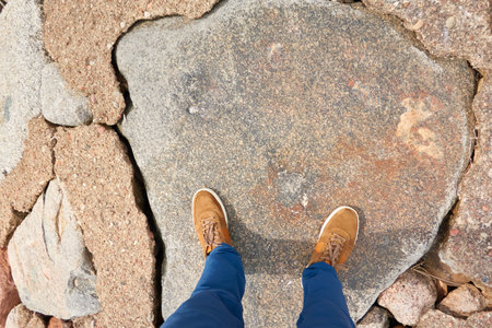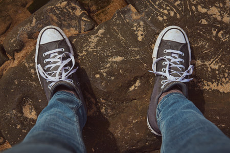 Close-up of a person wearing casual sneakers and blue jeans standing on a rocky surface. The image showcases the simplicity and ruggedness of an outdoor adventure.
