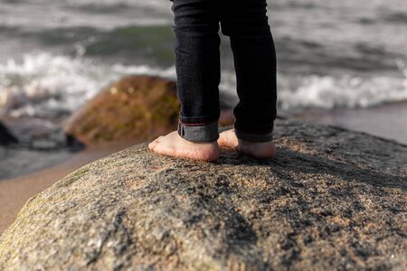Female feet on the stone rocky shore of the sea.