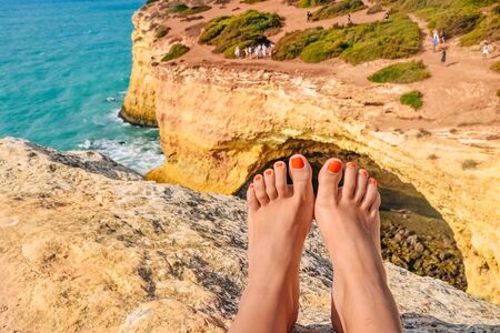 feet against a cliff on the famous Benagil beach in Portugal, waves crashing on the rocks, the raging ocean