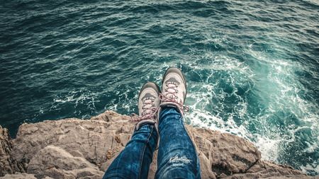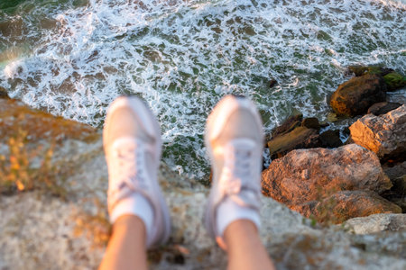 view from the mountain to the raging sea waves. Women's Legs in sneakers hang from the mountain, blurry focus. Travel and tourism.