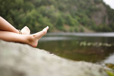 Side view girl relaxing barefoot on rock by lake
