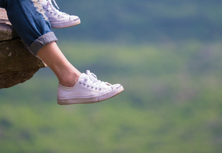 white shoes on woman feet which sitting on the moutain edge