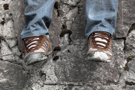The feet of a young man wearing trainers standing on the rocks