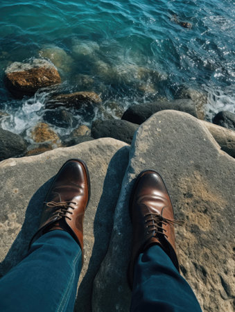 The image shows a persons legs wearing brown leather shoes and blue jeans, sitting on a rocky shore with the sea in the background.