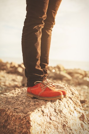 Legs in yellow rough hiking boots on the pebble beach. Travel concept.