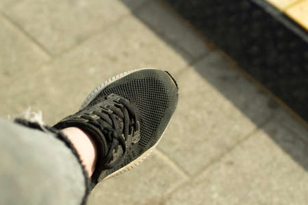 Female legs in sneakers on paving stones. Woman feet top view. Prague street