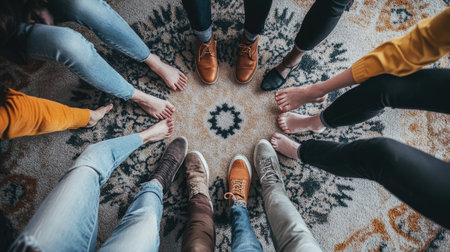 A group of diverse individuals gathers in a cozy circle on a beautifully patterned rug, showcasing their bare feet and colorful shoes, symbolizing unity and friendship.