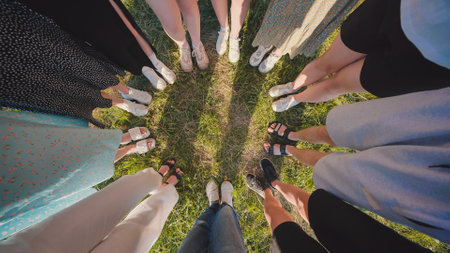 Diverse group of friends standing in a circle on lush green grass, enjoying a sunny summer day. They wear casual clothes and various shoes, radiating happiness and friendship