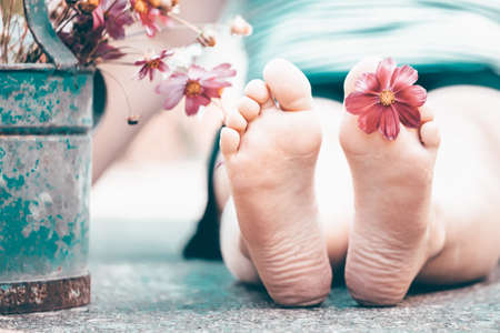 Child with cosmos flowers between toes lying near a vintage watering can in the garden.