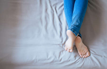 Close up of woman legs with blue jeans,Feet and stretch lazily on the bed