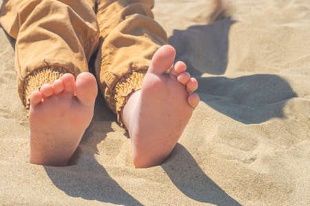 Two bare feet in sand particles, separately, one fragment, against the background of the blurred sea, on a pebble beach.