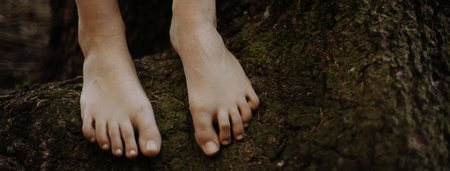 Close-up of barefoot legs walking in nature. Concept of healthy feet.