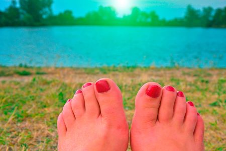 Female feet with red pedicure on grass with water background. Summer and holiday concept