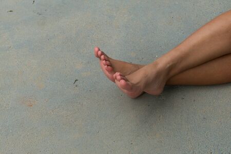 2 feet are standing on the old Rough floor is made from cement, concrete and sand. It has a hard , dirty and damage surface. white ruined industrial brick wall with copy space.