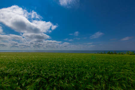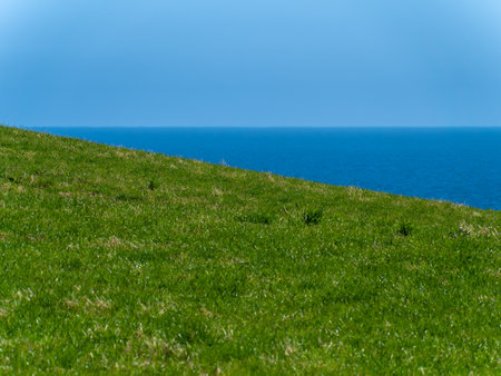 The green coast and the sea under the blue sky. minimalist landscape. green grass field near blue sea under blue sky