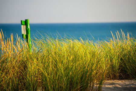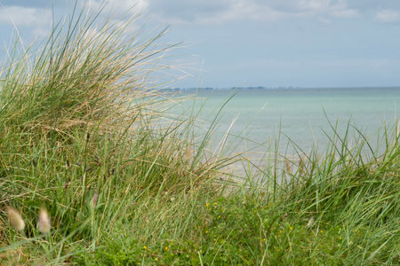 Ocean costal beachgrass of Utah beach on dune under light blue white clouded sky