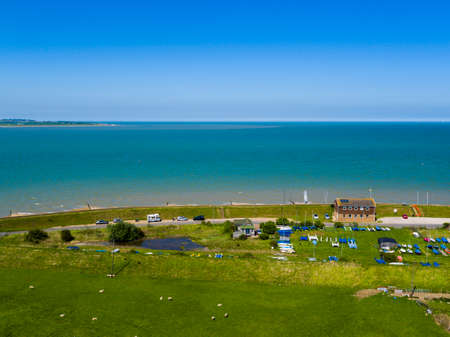 Tranquil Stretch Along the North Sea Features Lined Beach Huts, Green Grass, and Clear Blue Sky, Highlighting the Peacefulness of the Coastal Environment.