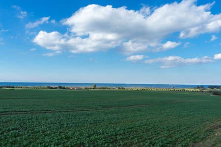 Rapeseed yellow green field with the sea in the background in spring Oland, Swedwn,