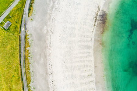 Aerial view of the wide sandy Kilmurvey Beach on Inishmore, the largest of the Aran Islands in Galway Bay, Ireland.