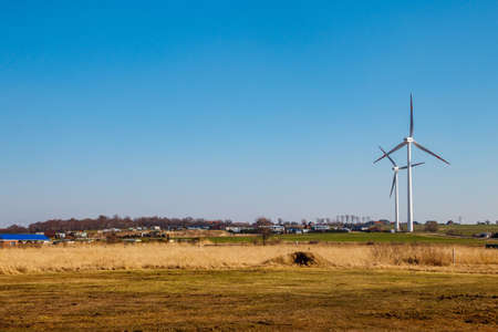 Field with fresh green grass against a blue sky and wind turbines. Agricultural landscape.