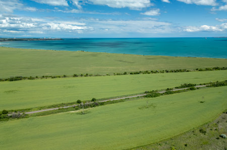 Aerial view of green fields and turquoise sea on the coast of Bulgaria. Scenic landscape with farmland, road, and distant horizon under a partly cloudy sky