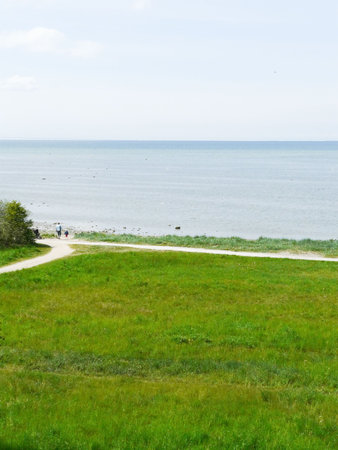 Baltic coastline. Escarpment slope lead to pebble beach. People walking along the shore hanseatic City of Luebeck - Travemuende, Germany