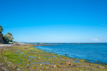 Sandy shore of the Baltic sea on a sunny summer day. Stones and green algae close-up. Clear blue sky with cirrus and cumulus clouds. Idyllic landscape. Recreation theme. Germany. Panoramic view