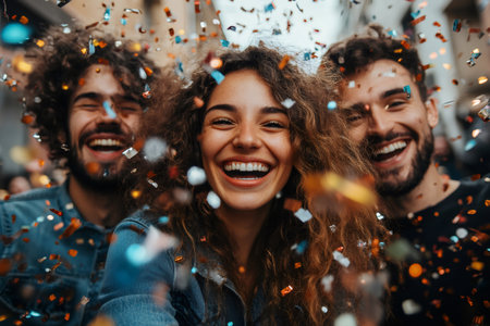 Group of friends laughing, feeling joy during a colorful confetti celebration