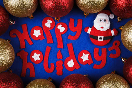 Christmas concept, decorative lettering made of felt, and toy Santa Claus with red and gold balls