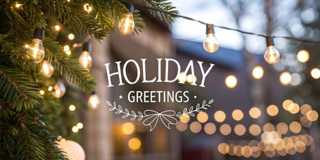 Warm festive holiday greeting card with glowing lights, pine tree branches, and soft city bokeh in the background. Cozy urban winter mood.