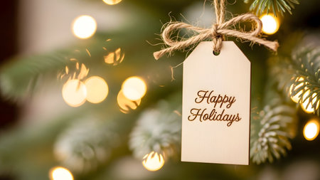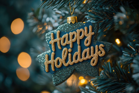 Christmas tree ornament with golden happy holidays writing hanging on a Christmas tree with blurred lights in the background