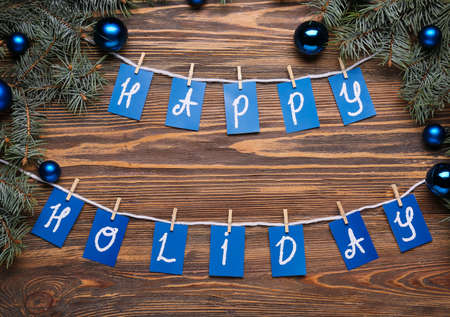 Text HAPPY HOLIDAY, fir tree branches and Christmas balls on wooden background