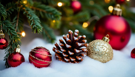 Elegant red and gold christmas balls hanging amidst glowing festive lights