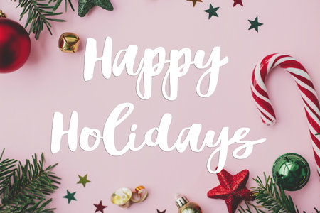 Happy Holidays text sign on christmas festive decorations, confetti, fir branches frame on pink background flat lay. Season's greeting card. Christmas postcard