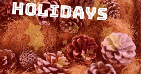 Pine cones resting on orange fibers, with HOLIDAYS text overlaying. Golden stars add festive touch to composition